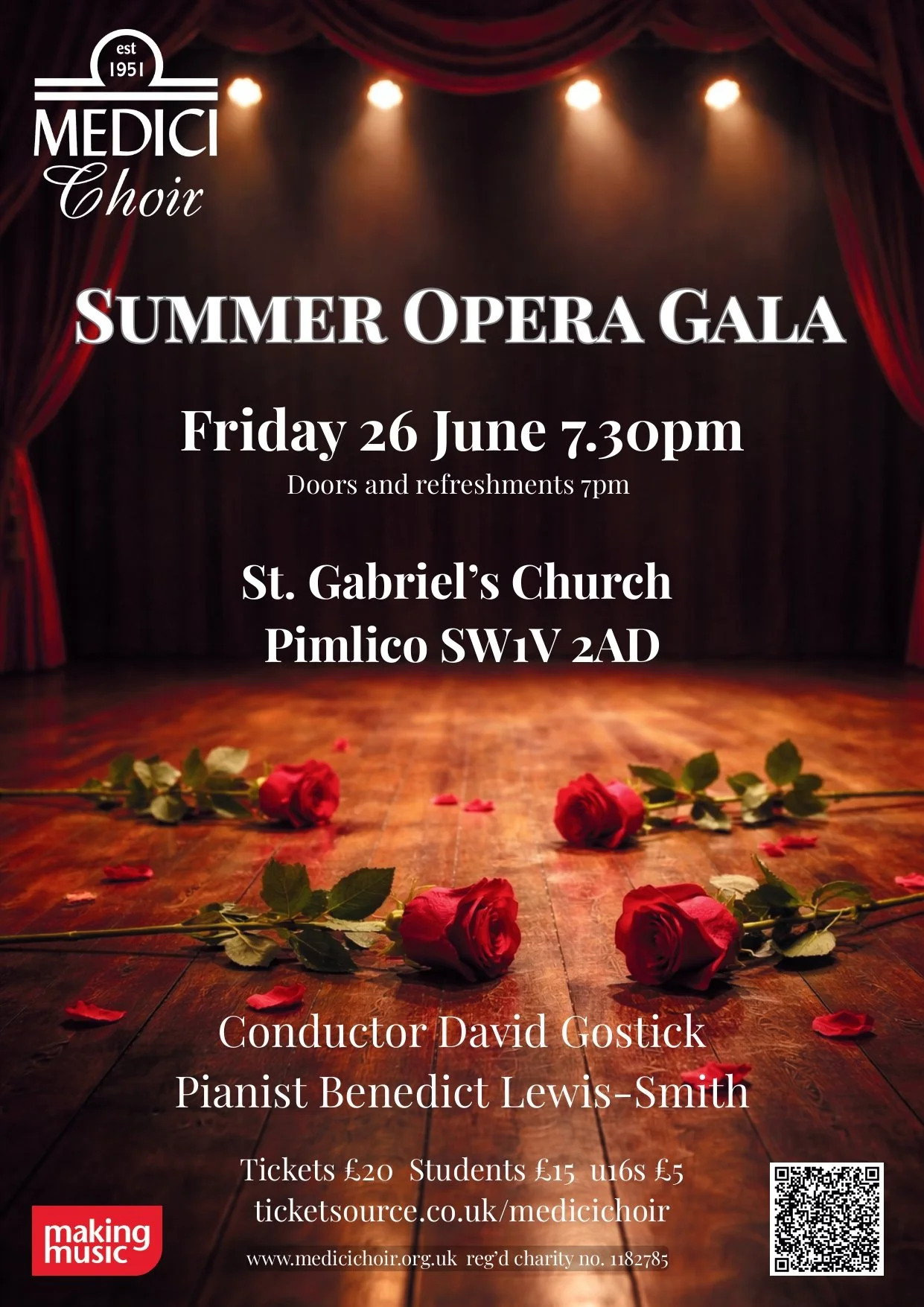 From Purcell to Puccini via Verdi and Wagner, a selection of opera choruses will be sung by the Medici Choir with soprano and baritone soloists.